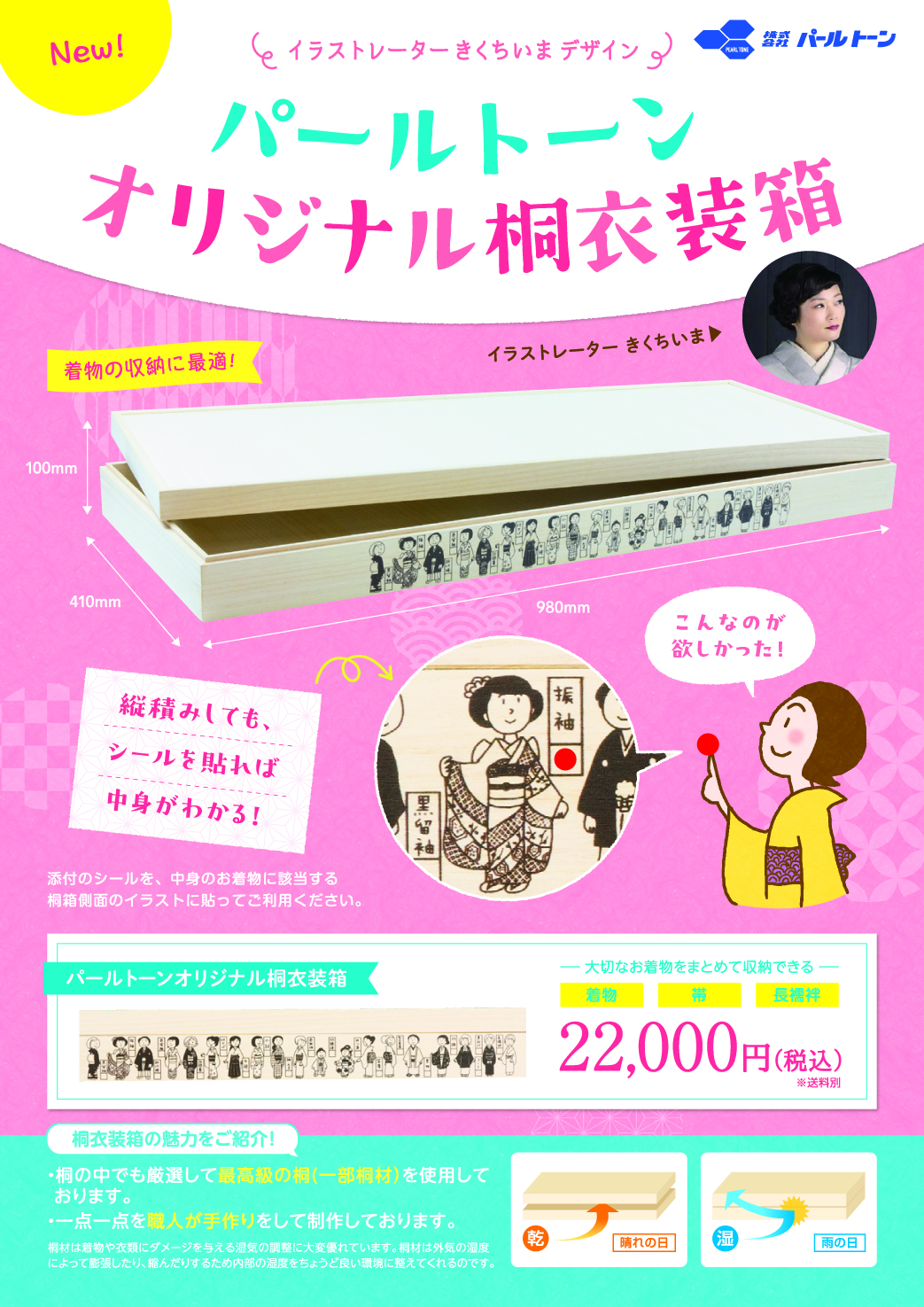 新作・販売会 Tags250616 パールトーン オリジナル桐衣裳箱 きくちいま イラスト入り 桐衣裳箱の魅力を生かす 2025年6月18日 0 パールトーンは、2023年12月より販売している「京の除湿・脱臭シートトリマス」に続き、収納・保管商品第二弾として『きくちいまイラスト入りオリジナル桐衣裳箱』の販売をスタートさせた。今回の商品は、桐衣裳箱のデメリットである、『中にどの着物が入っているのか確認しにくい』ことを『きくちいまイラスト』で解… 残り283文字(全文: 434文字) ログインして続きを見る すでに会員の方はこちらから 染織新報(新聞)を契約済の方 WEB版を会員登録済みの方 新たに会員登録をして続きを見る その場で会員登録をして続きを見ることができます。請求書は後日郵送いたします。 新規会員登録 ※. 本ウェブサイトの記事の著作権は染織新報社に帰属します。無断転載を禁止いたします。 前の記事ヤマノホールディングス フリーサイズのプレタデニムのきもの販売スタート次の記事京都の有力前売問屋 5月の動向 最高の企業は前年比105.5% More articles 「京友禅総合展」 2025染匠新作発表会 カフタン... 2025年10月8日 やまと・ハレノヒ小袖 オリジナルの洗えるきもの 2025年10月8日 甚平ゆかた KUTANI× KIMONO テクシオ... 2025年10月8日 返事を書く 返事をキャンセル コメント: あなたのコメントを入力してください。 名前:* ここにあなたの名前を入力してください Eメール:* 間違ったメールアドレスを入力しました。 ここにあなたのEメールアドレスを入力してください ウェブサイト: 次回の私のコメントのためにこのブラウザに私の名前、電子メール、そしてウェブサイトを保存してください。 Latest article 〈ファーストイノベーション〉JFCAフォーマルウェ... 2025年10月8日 【短信】 2025年10月8日 〈中川政七商店〉ロンドンに初のポップアップストア 2025年10月8日 〈水鳥工業〉新しい楽しみ方 「育てる下駄」 2025年10月8日 展覧会ご案内 (芸術・文化・企画展 他) 2025年10月8日