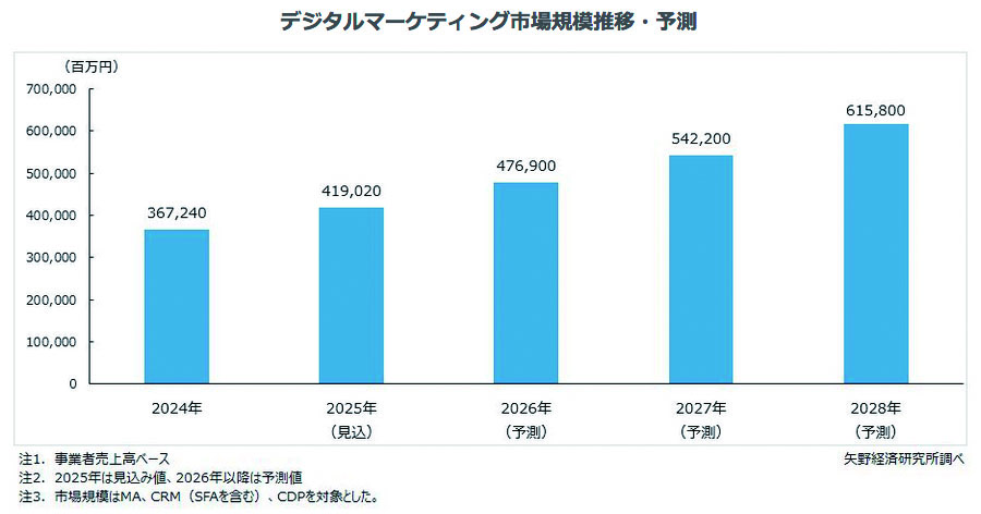 人事・信用情報 Tags250906 デジタルマーケティング市場調査 2025年は4190億円に成長の見込み、今後はAI関連機能の拡充がポイントに 矢野経済研究所 2025年9月9日 0 ㈱矢野経済研究所は、国内のデジタルマーケティング市場を調査し、市場概況、参入企業の動向や将来展望を明らかにした。2024年の国内のデジタルマーケティング市場規模は、事業者売上高ベースで3672億4000万円と推計。2025年の同市場は前年比114・1%の4190億2000万円に成長する見込み。市場が… 残り1028文字(全文: 1179文字) ログインして続きを見る すでに会員の方はこちらから 染織新報(新聞)を契約済の方 WEB版を会員登録済みの方 新たに会員登録をして続きを見る その場で会員登録をして続きを見ることができます。請求書は後日郵送いたします。 新規会員登録 ※. 本ウェブサイトの記事の著作権は染織新報社に帰属します。無断転載を禁止いたします。 前の記事室町問屋の展示会のご案内 9月次の記事染織新報社刊「2026 振袖取り組みアンケート」 More articles 帝国データバンク 宝飾店の倒産、過去20年で最少 ... 2025年10月8日 京都の有力前売問屋 8月の動向 2025年9月30日 やしまグループ 50期にグループ100億目指す 第... 2025年9月30日 返事を書く 返事をキャンセル コメント: あなたのコメントを入力してください。 名前:* ここにあなたの名前を入力してください Eメール:* 間違ったメールアドレスを入力しました。 ここにあなたのEメールアドレスを入力してください ウェブサイト: 次回の私のコメントのためにこのブラウザに私の名前、電子メール、そしてウェブサイトを保存してください。 Latest article 〈ファーストイノベーション〉JFCAフォーマルウェ... 2025年10月8日 【短信】 2025年10月8日 〈中川政七商店〉ロンドンに初のポップアップストア 2025年10月8日 〈水鳥工業〉新しい楽しみ方 「育てる下駄」 2025年10月8日 展覧会ご案内 (芸術・文化・企画展 他) 2025年10月8日